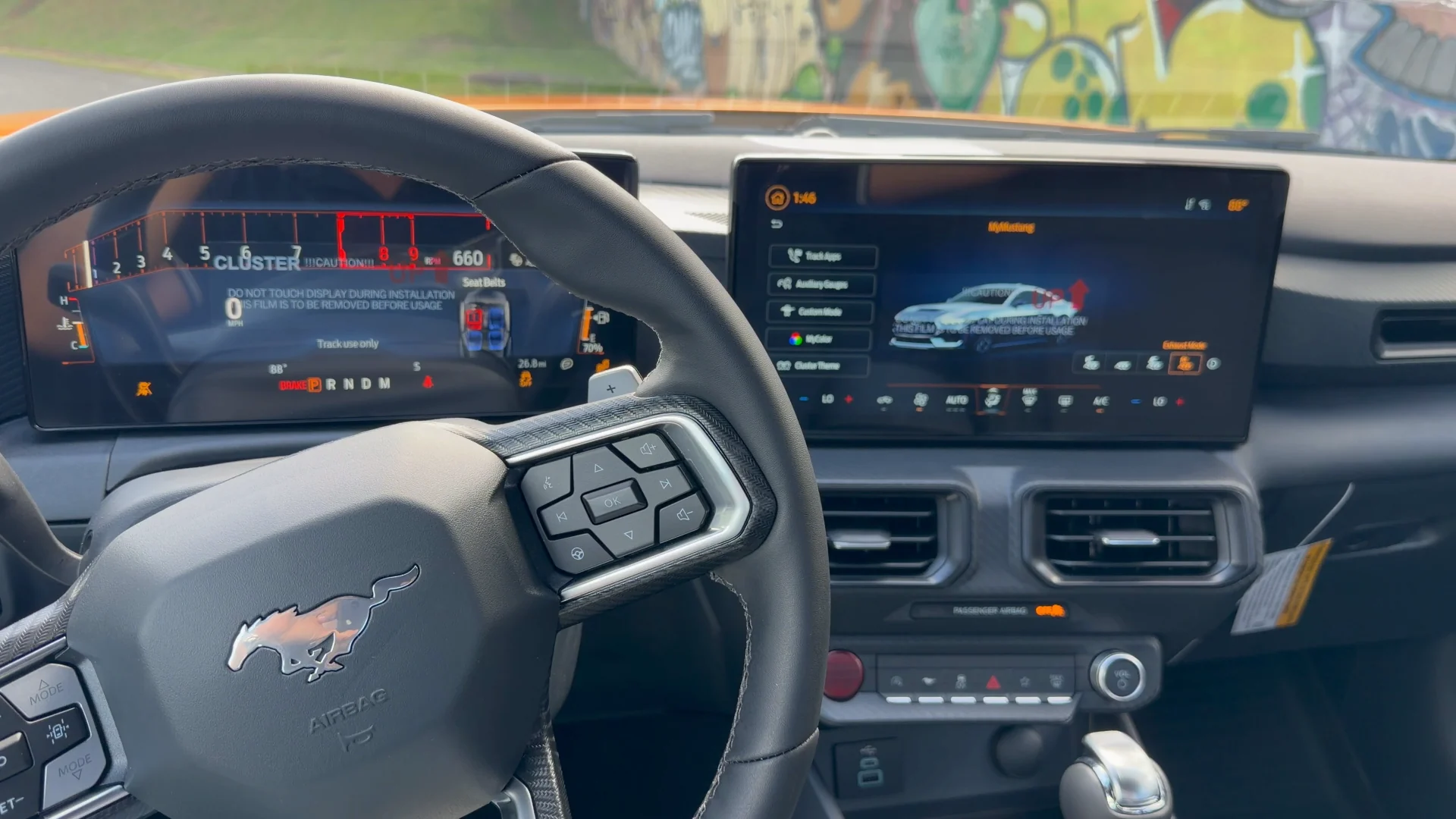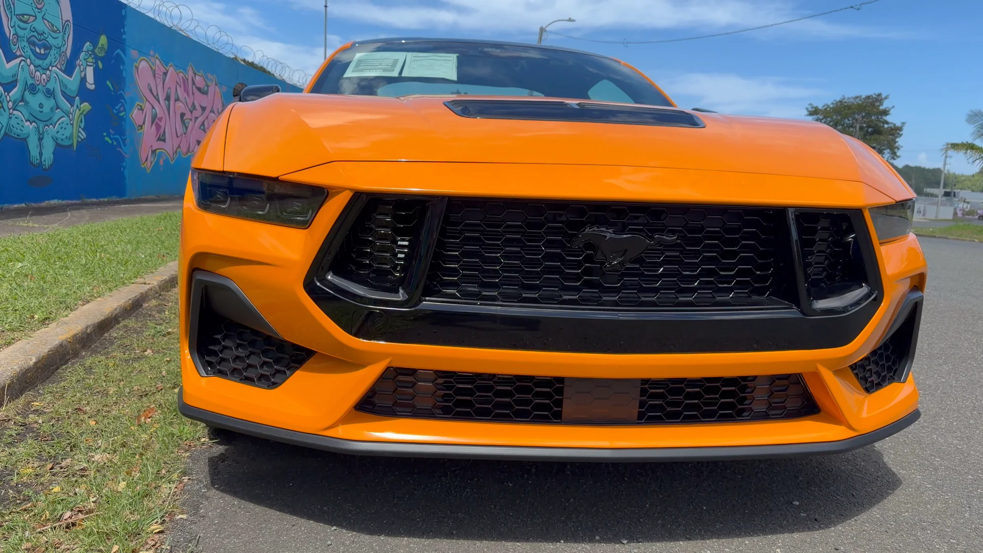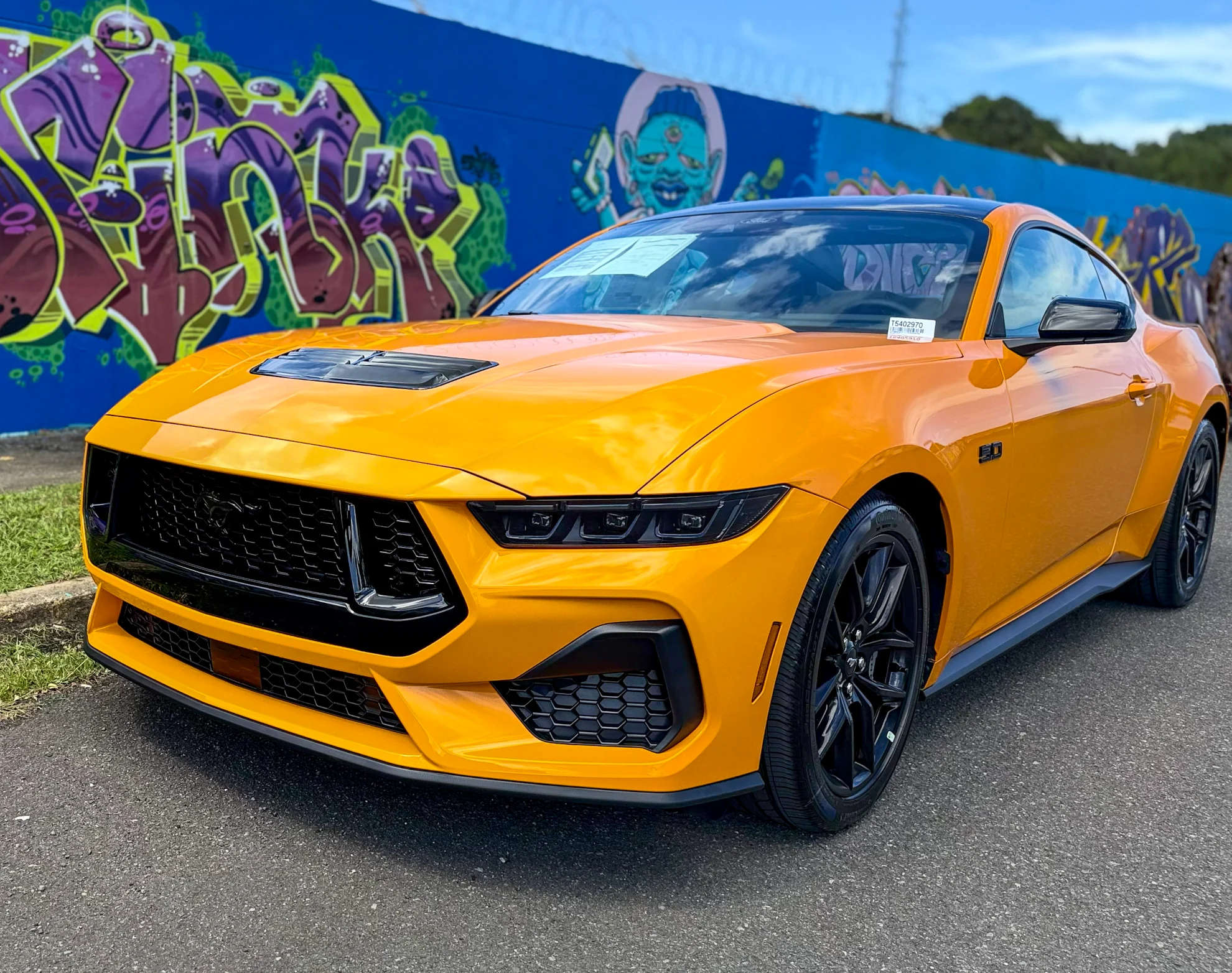 La composición presenta el icónico Mustang GT de 480 caballos de fuerza, en su distintivo color Orange Fury Metallic, fusionando arquitectura histórica con una estética moderna y cinematográfica.