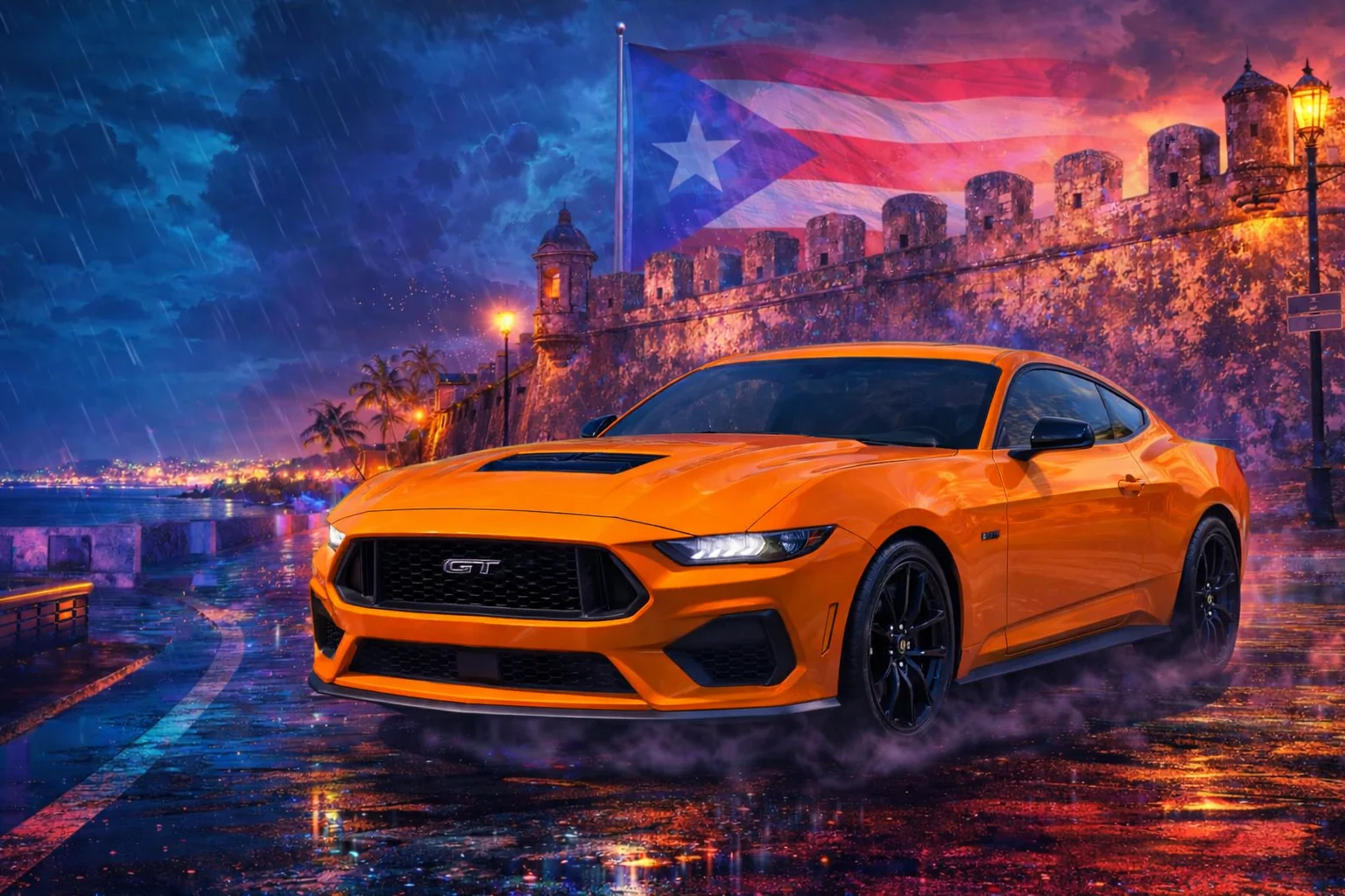 Estás adquiriendo una obra de arte digital original de temática automotriz, protagonizada por el Ford Mustang GT 2026, reinterpretado artísticamente en un entorno nocturno inspirado en el histórico Castillo San Felipe del Morro en Puerto Rico.